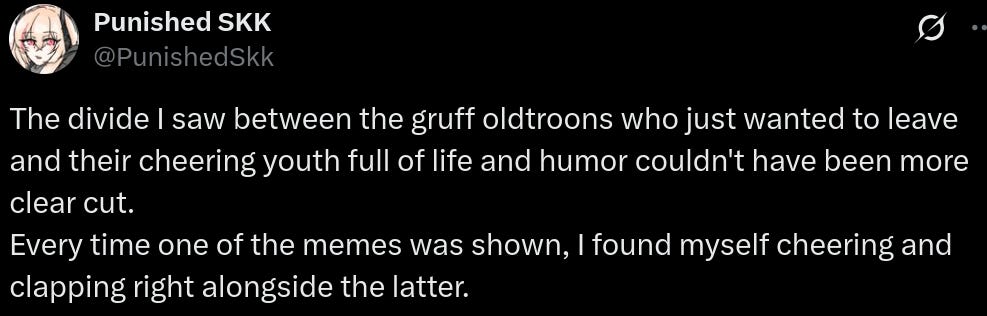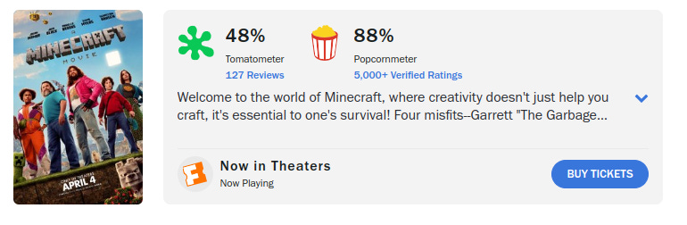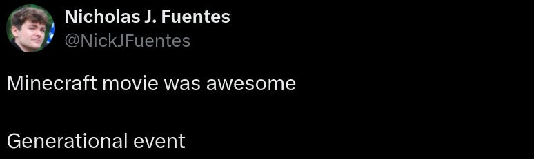 On the topic of the movie’s success, A Minecraft Movie is the 25th biggest opening weekend of all time. As the viral marketing TikToks continue, I predict the movie will wind up in the top 20 biggest box office successes of all time. As commentators like to point out, this is despite a mediocre critical reception—once again proving that what the critics think does not matter. The audience loved it, the kids loved it, the parents loved that their kids loved it, and the teens loved the experience of it. This is how quality is measured—not the thoughts of some shitlib journo wine aunt.