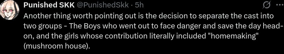 Thirdly, the movie is essentially all white, with only a token Black woman character as an exception—and even her character is played for laughs. The movie has no oppression narrative associated, besides creative smart people being oppressed by society. This is rare—even apolitical modern movies have a left-coded oppression narrative associated. Minecraft having none is a welcome change.